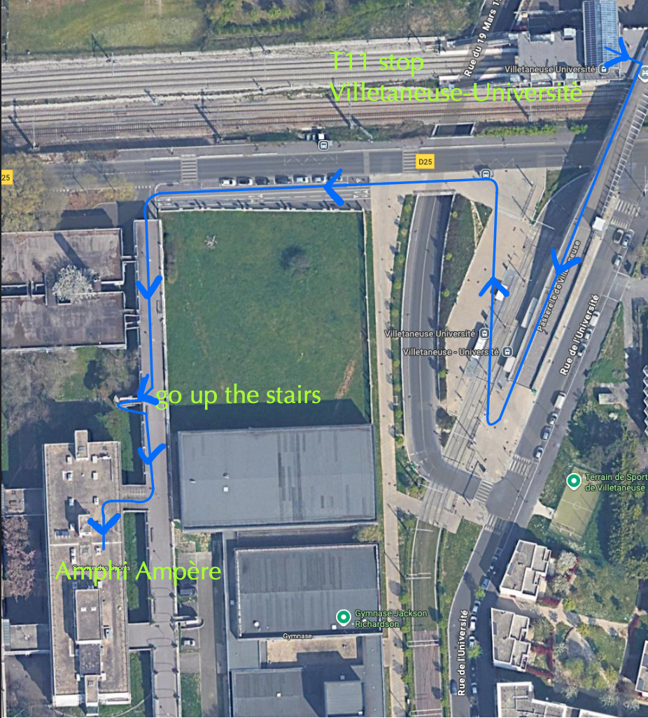 After getting off at T11 stop Villetaneuse-Université, follow the walking directions on the map below to reach the Ampère Lecture Hall.
